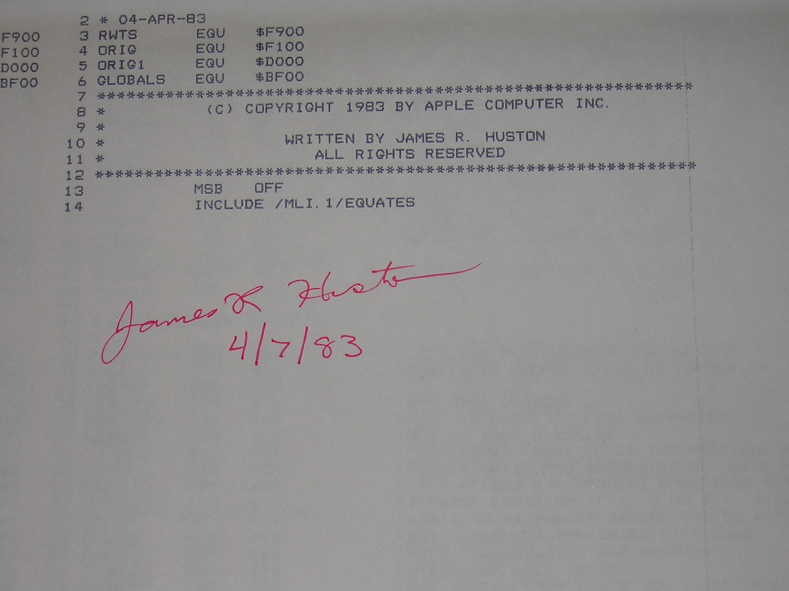 | Back Story: Apple II ProDOS, introduced in 1982, almost didn't ship. The project was cancelled just as it was finishing up and preparing for introduction. There was a great concern within Apple as to whether or not the introduction of ProDOS would cause confusion in the market place. After all, it offered the same file system capabilities as Apple III SOS - including direct support for hard drives, and enabled the porting of some of the most popular Apple III productivity software onto the Apple II. At the time, the Apple III was Apple's direct answer to IBM, and Apple II was targeted for education, home, and personal use. Wouldn't ProDOS muddle the differentiation? And with Lisa already shipping, and Macintosh on the way, shouldn't the Apple II be expected to reach its retirement age in a year or two? All very good concerns to consider! Well, Lisa wasn't selling very well, the Apple III was barely turning a profit, and Macintosh was still more than a year away... and the Apple II was still rising in sales rates! A meeting of the Apple Board of Directors decided the matter. ProDOS would be offered, giving Apple II users a choice of operating systems and access to more professional software and hardware. The message was clear: product "turf" would be decided by the marketplace, not divided and protected for the various Apple divisions. This allowed Macintosh to undermine Lisa's market, the Apple II line to extend to the Apple IIGS (which competed with low end Macintoshes), and later on the iBook to be offered when the PowerBook dominated. The long term benefit has been a healthy Apple Incorporated! By the way - if you are curious about what the author of ProDOS looked like, see "Beneath Apple ProDOS" by Don Worth and Pieter Lechner. Dick's Portrait, with the title "Founding Father, can be seen on page 2-6 (thanks Don, Pieter, and George!). Offered here is an original "Golden Master" code listing - a part of the documentation release for ProDOS version 1.0. The listing is signed and dated by the author on the first (title) page of the listing. ProDOS was written entirely in assembly language by a single author... maybe the only commercially offered personal computer file system so created. It was almost certainly the last. |