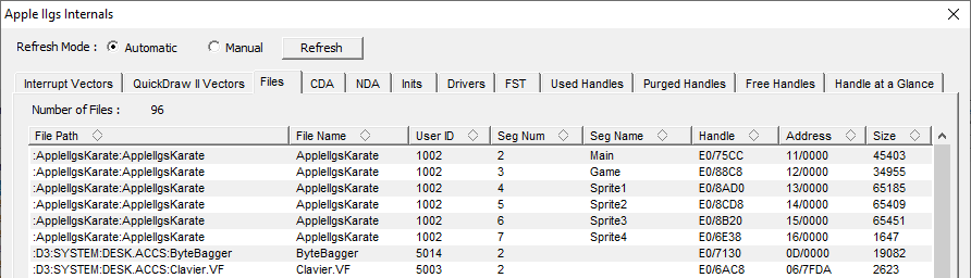 Let's discuss the usage of Symbols Files by taking a GS/OS application like AppleIIgsKarate as exemple. This program has 6 segments (Main, Game, Sprite1, Sprite2, Sprite3 and Sprite4)