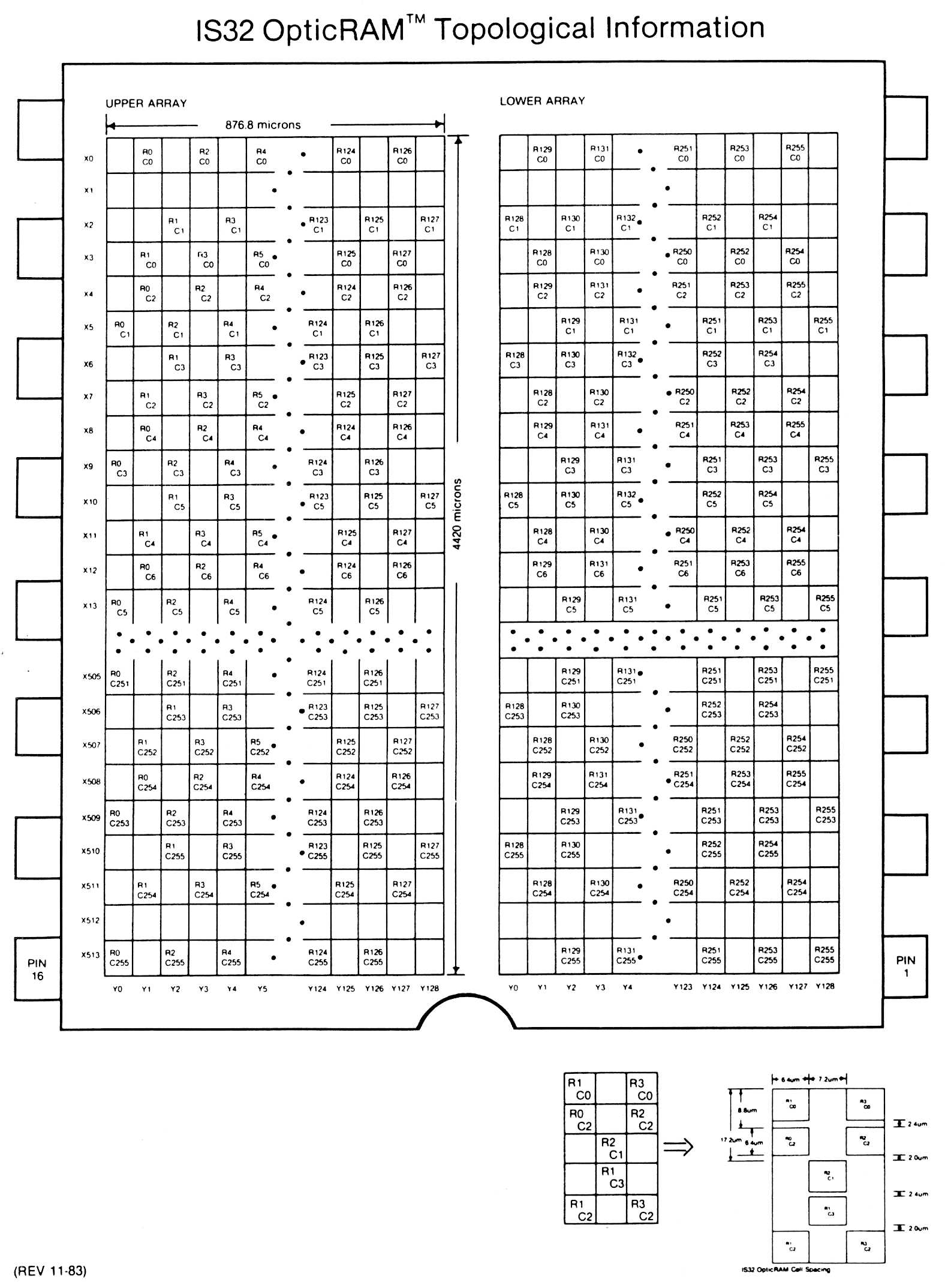 To accomodate the pixel misplacement, the data from the optics must be mapped into the graphics matrix so that the arrangement of the pixels in the graphic matrix matches the physical arrangement of the cells in the OpticRAM. Due to the interleaved cell pattern on the OpticRAM, the array is much longer than it is wide, resulting is spaces between the cells in the column direction. Because of the spaces, the 128 X 256 array of cells will map very nicely into a 129 X 514 matrix. We will call this matrix the Cell Placement Grid.